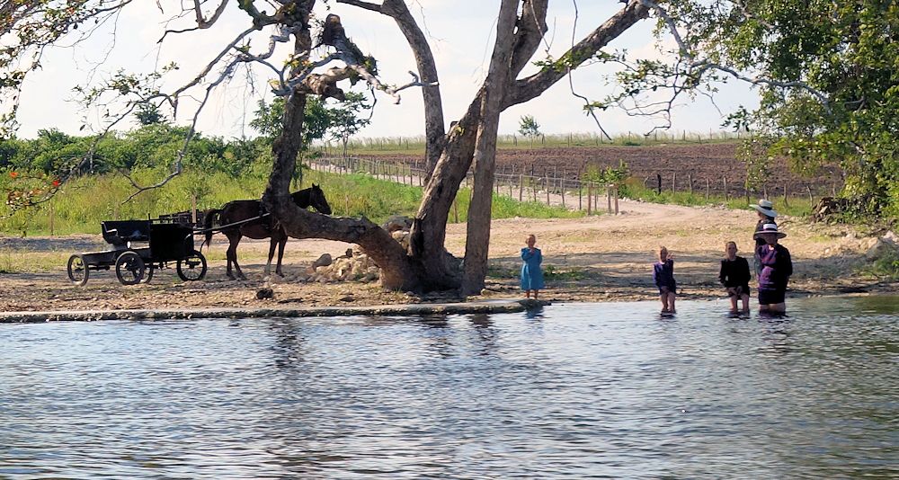 Heute am Sonntag haben die Mennoniten ihr Pferd angespannt und sind zum Baden an den Fluß gefahren.
