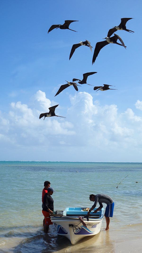 Die Fregattvögel, sonst nur hoch am Himmel zu sehen, wolllen auch was vom Fang.