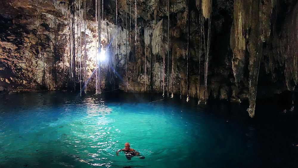 Die Halbinsel Yucatan hat je hunderte Cenotes. Das sind unterirdische Becken die ganzjährig Wasser führen und viele sind so erschlossen, das man sie gut erkunden und sogar darin schwimmen kann: in klarem, blauschimmernden Süßwasser. Ok, ein paar Fische schwimmen immer mit.