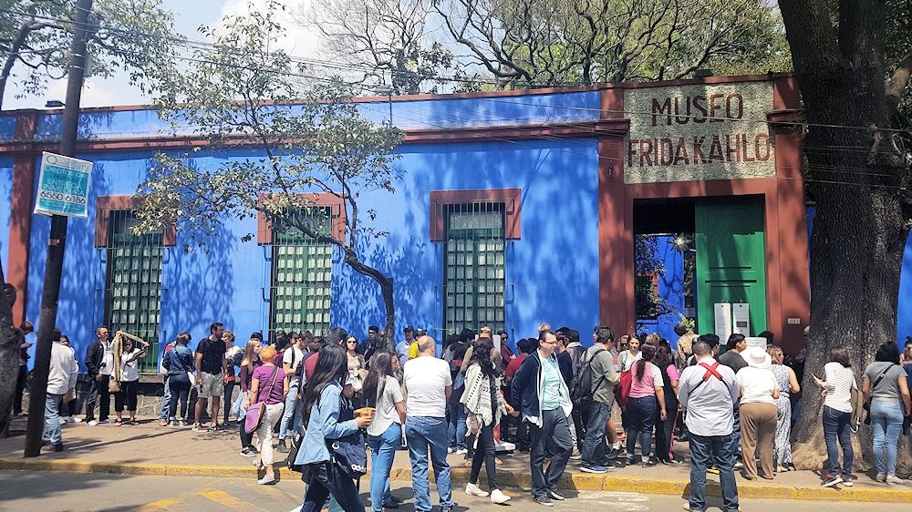 Unser eigentliches Ziel, die "Casa Azul", lag 600 m nördlich der Plaza Hidalgo und war das langjährige Wohnhaus von Frida Kahlo und ihrem Ehemann Diego Rivera. Allerdings hatten wir nicht damit gerechnet, dass heute am Samstag, viele andere Besucher das gleiche vorhatten. Ein 100 m lange Schlange stand vor dem Eingang.