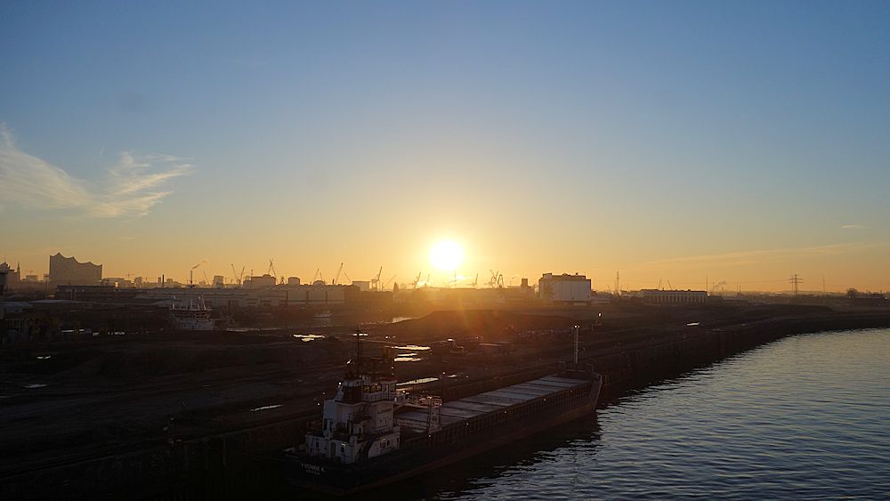 24.03.2017, Hamburg, DeutschlandDas Timing für Hamburg war insofern schlecht, weil wir die Fahrt auf der Elbe noch in der Nacht machten. Als wir bei Sonnenaufgang an Deck gingen, waren wir bereits fast am Anleger.