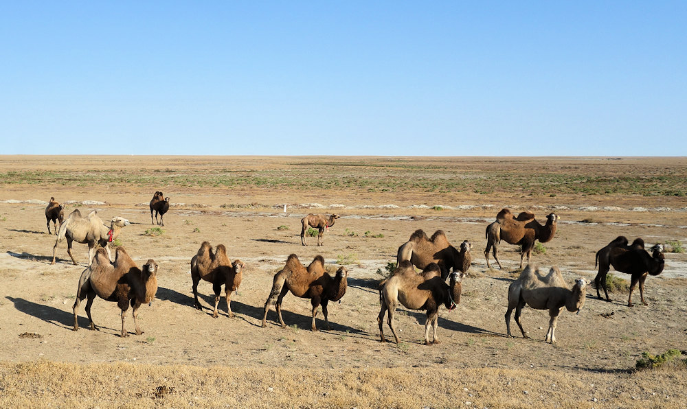13.09.2017, In der Steppe, Kasachstan Kasachstan ist für uns nur eine Durchfahrtstrecke nach Usbekistan, da im Süden Kasachstans nicht viel zu sehen ist. Das heißt es gibt genügend Steppe, Kamele, Dromedare, Pferde, Kühe und Ziegen die frei in der Steppe umherziehen. Sie sind nicht wild, sondern werden so gehalten. Schön für die Tiere.