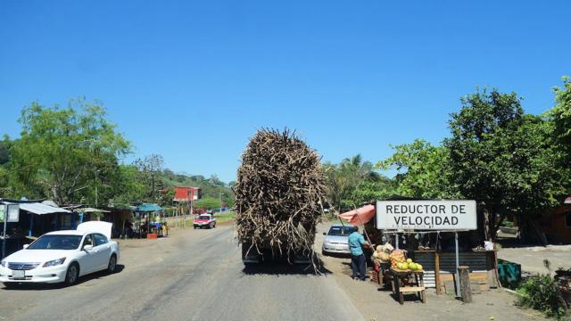Zuckerrohrlaster auf der Straße nach Veracruz. Dieser Tope (hier Reductor de Velocidad gennant) ist auf der Straße fast nicht zu erkennen, hier aber ausnahmsweise mit einem Schild gekennzeichnet. Sonst erkennt man sie am Besten, wenn man auf Zuckerrohr am Boden achtet, weil jeder Zuckerrohrlaster eine paar Stangen verliert, wenn er über den Tope hoppelt. |
