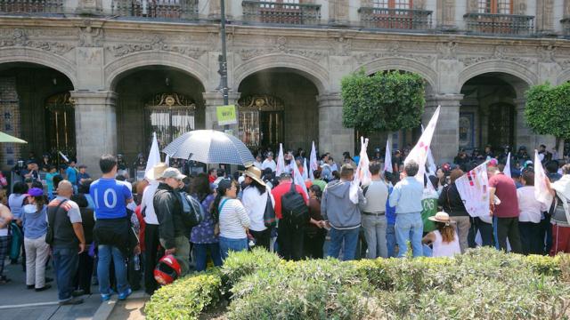 Demonstration vor dem Rathaus einer Delegation, einem der 16 Verwaltungsbezirke Mexiko-Cities. Demonstrationen haben wir in allen Großstädten Mexikos erlebt. Man beachte die Polizeimacht unter den Arkaden.