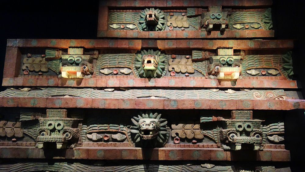 50 km nördlich von Mexiko City liegt Teotihuacán. Dies ist eine Teil-Replik des Quetzalcóatl-Pyramide.Abwechselnd ist der Regengott Tláloc und Quetzalcóatl (gefiederte Schlange) dargestellt.