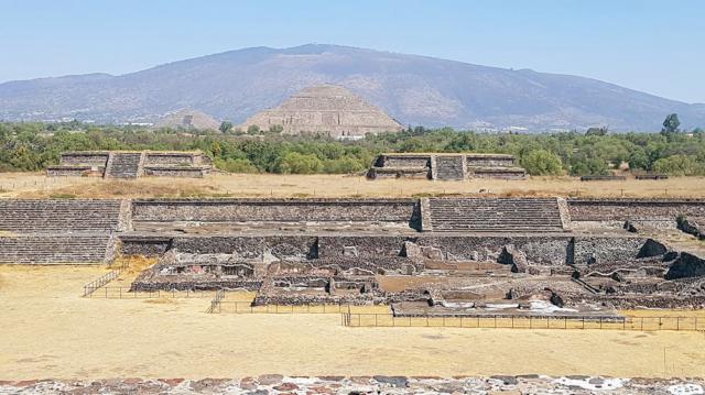 Teotihuacán: Blick von der Quetzalcóatl-Pyramide nach Norden zu der Sonnen- und der Mondpyramide