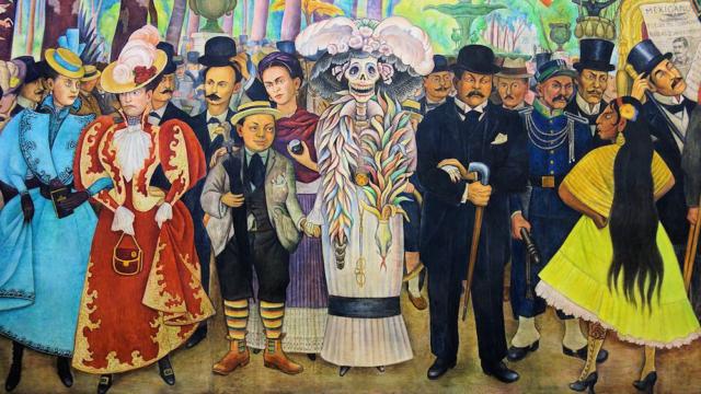 Der zentrale Bildausschnitt zeigt u.a. seine Ehefrau Frida Kahlo und Diego Rivera davor als Kind.