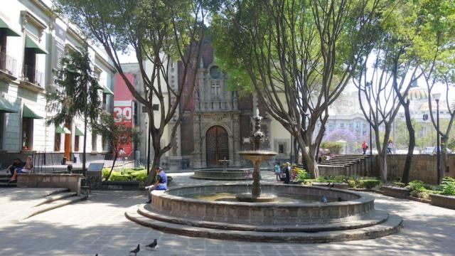 Vorplatz vor dem Museo Franz Mayer. Man beachte das Platzniveau gegenüber dem Straßenniveau - Folge des Einsinkens der historischen Gebäude.