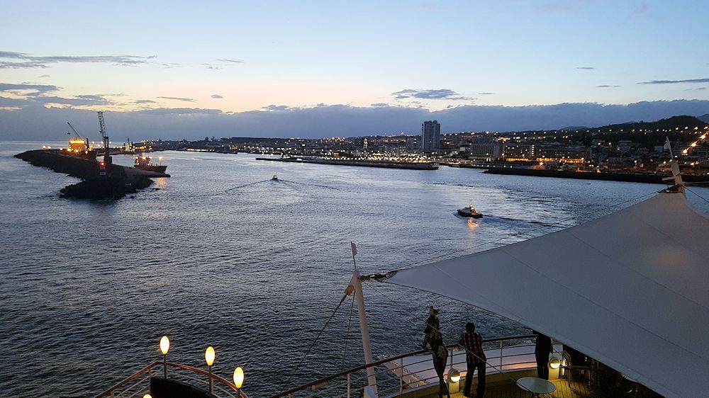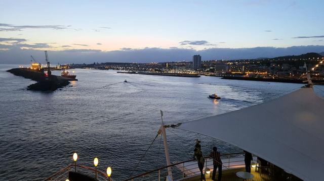Abends beim Auslaufen. Der Lotse hat bereits die AIDAvita verlassen und steuert an Land.