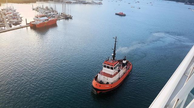 Abends verlassen wir den Naturhafen von Falmouth mit Schlepperhilfe. Nicht ganz, weil die Schlepper nur Stand-By waren, wenn z.B. eine Windboe die AIDAvita ans Kai drücken würde.