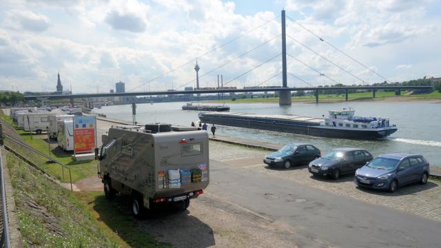 Stellplatz an der Rheinpromenade in Düsseldorf mit phantastischer Aussicht.
