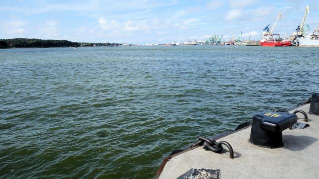 Blick auf das Haff vor Klaipeda. Links ist die Kurische Nehrung. Der Ausgang des Haffs in die Ostsee ist nicht zu erkennen, weil er hinter der Biegung liegt.