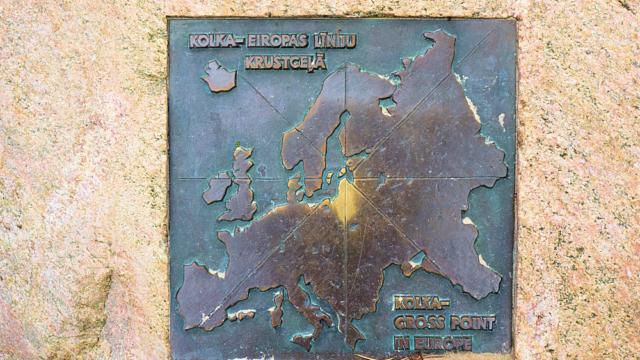 Es gibt versch. Berechnungen zur geographischen Mitte Europas. Diese lettische Berechnung stellt Kap Kolka in den Mittelpunkt.