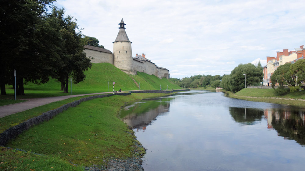 Die zum Flüßchen Pskowa gelegene Seite des Kreml ...