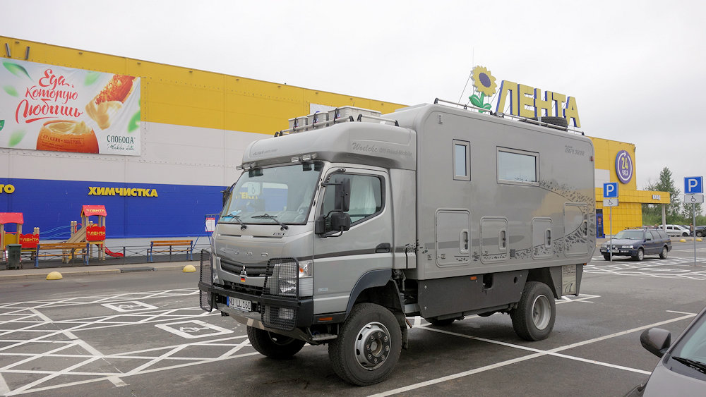 Vor dem Supermarkt in Pskov: 7 Tage/24 Stunden geöffnet.