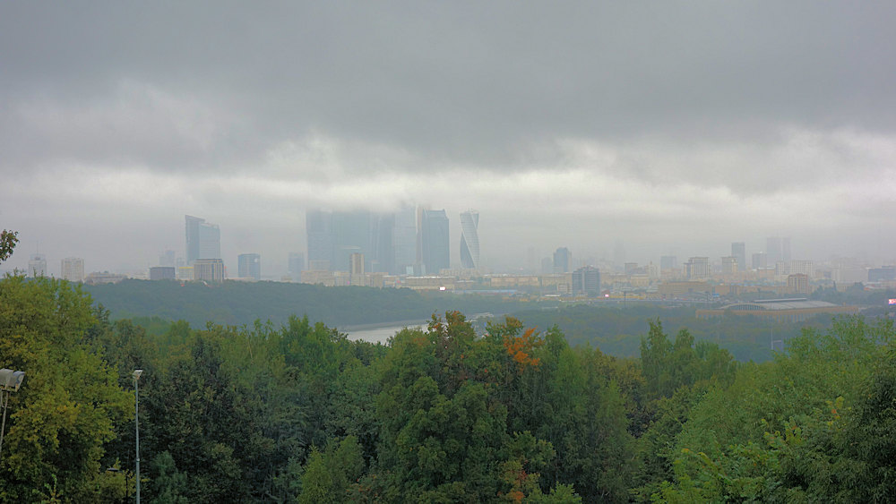 Das moderen Moskau verschwimmt in Regen und Nebel.