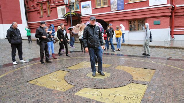 Davor der geographische Nullpunkt Russlands für Vermessungen. Das Werfen einer Münze über die Schulter soll Glück bringen.