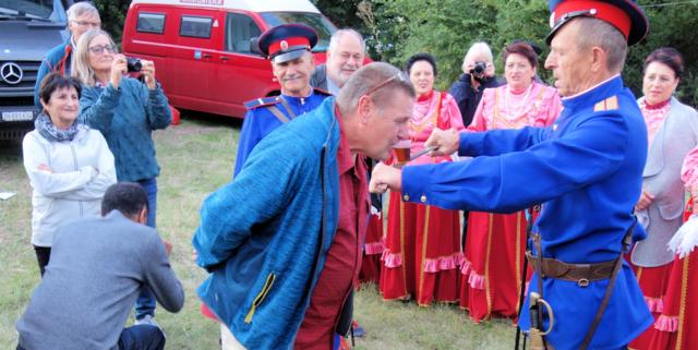 Manni muss zur Kosaken-Prüfung. Ein großes Glas Schnaps auf dem Säbel.
