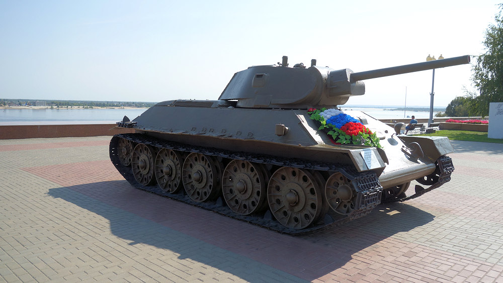 wird außen auch von einem T34 Panzer, die ja auch vor und nach der Stalingrad-Schlacht in Stalingrad produziert wurden, bewacht.