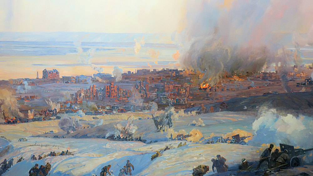 Hier ist in der Ferne die brennende Innenstadt zu sehen....
