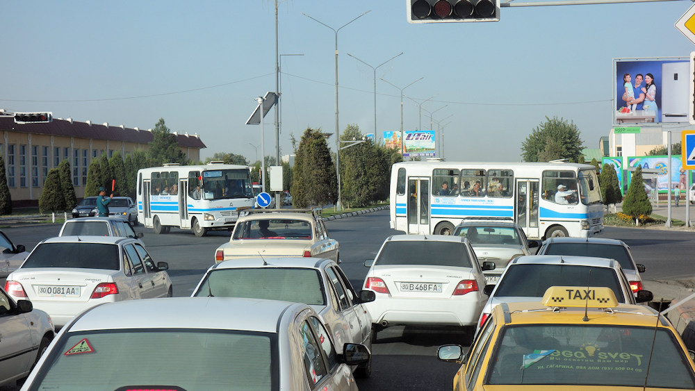Unsere Ausfahrt aus Samarkand verzögerte sich etwas, weil die Polizei zuerst riesige Kolonnen von Bussen für die Helfer bei der Baumwollernte durchlies.