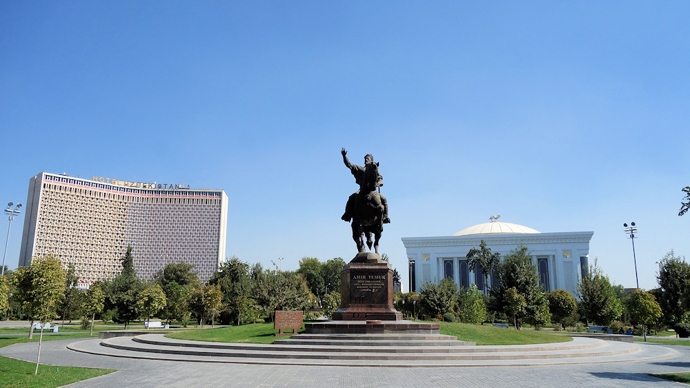 Das Denkmal für Amir Temur, der im 14. Jahrhundert ein gewaltiges Reich eroberte, bis an den Bosporus, und dessen Hauptstadt Samarkand war. Links unser Hotel, auf dessen Parkplatz wir standen.