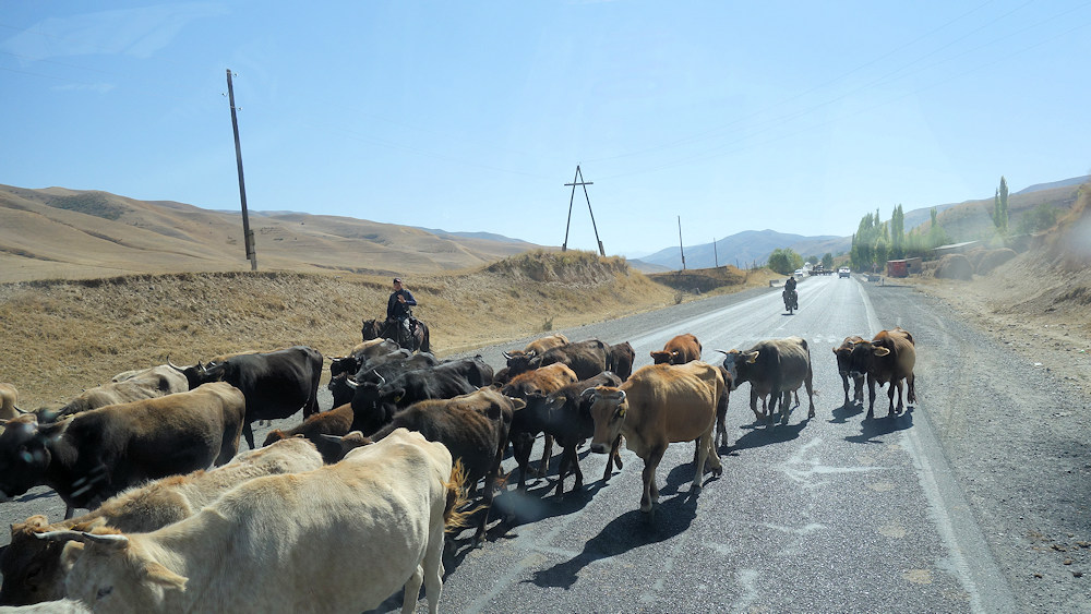 Auf der Fahrt Richtung chinesische Grenze: mindestens hundert Herden komen uns entgegen, weil der "Almabtrieb" in vollem Gange ist.