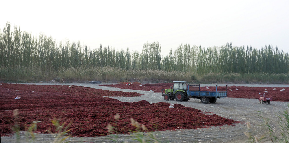 Nach der Abfahrt vom Bosten See: endlose Anbaugebiete von Chillies, die hier getrocknet werden.