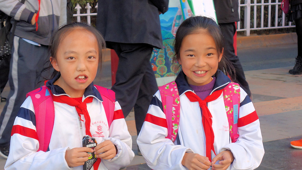 Zwei Chinesenmädchen zeigen sich über die Langnasen amüsiert.