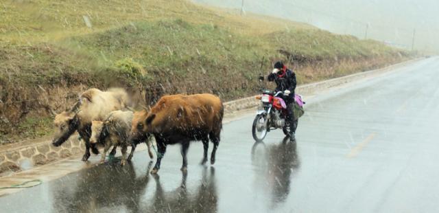 In über 3.500 m Höhe treibt dieser Bauer seine Yaks über die Landstraße.