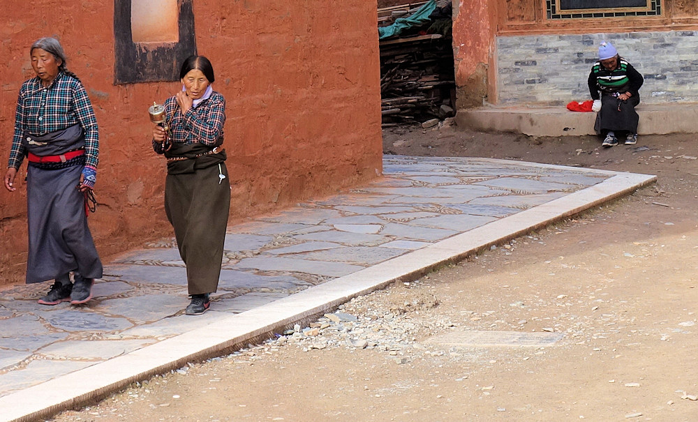 Gläubige umrunden einen der Tempel mit Hand-Gebetsmühlen.
