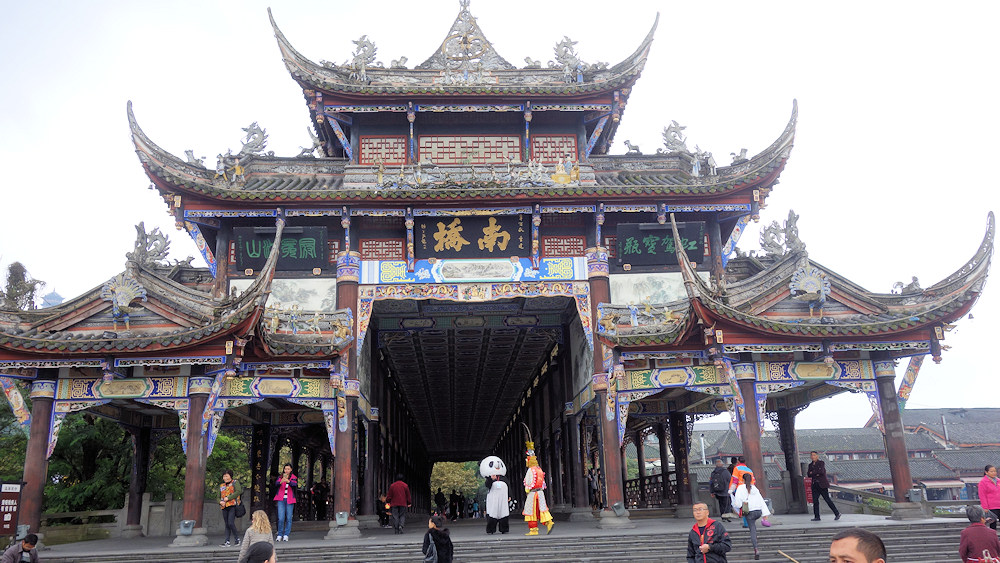 Auf der Brücke kann man sich mit zwei Symbolen von Chengdu fotografieren lassen: Dem Panda und der Sichuan-Oper.