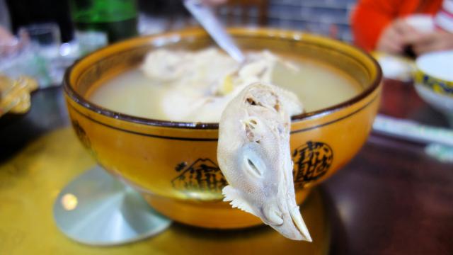 Thomas, Clara, Carsten und Katharina hatten sich Huhn bestellt. Was ankam war dieses im ganzen gekochte Huhn im Sud. Sehr schwierig das mit Stäbchen zu essen.