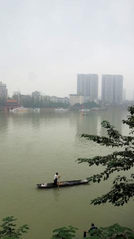 Der einsame Fischer passt so gar nicht zum modernen Stadtbild.