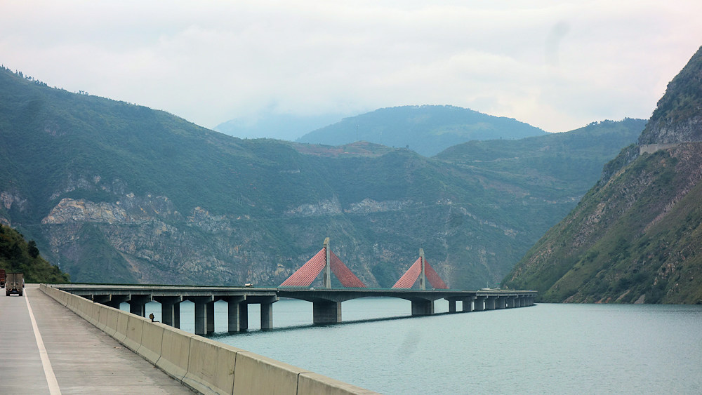 Wieder haben wir die chinesische Autobahn-Infrastruktur bewundert. Die Autobahn führt durch das Gebirge mittels endloser Brücken und Tunnel.