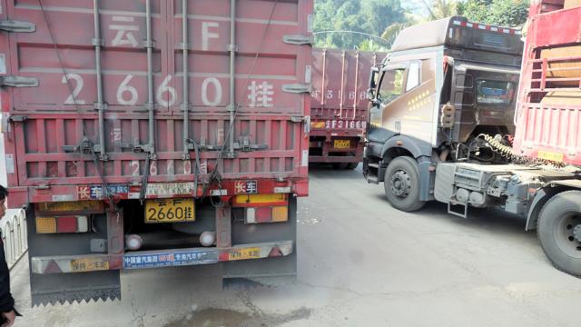 Im dichten LKW-Verkehr arbeiten wir uns an der chinesisch-laotischen Grenze vor.