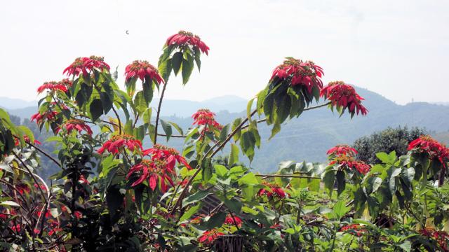Jetzt, Anfang November, weihnachtet es sehr. Die Weihnachtssterne sind hier ausgewachsene große Büsche.
