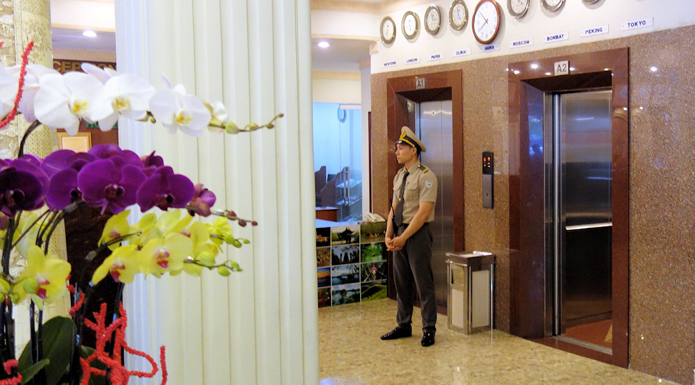 Wir verlassen unser gut bewachtes Hotel in Saigon am Morgen...