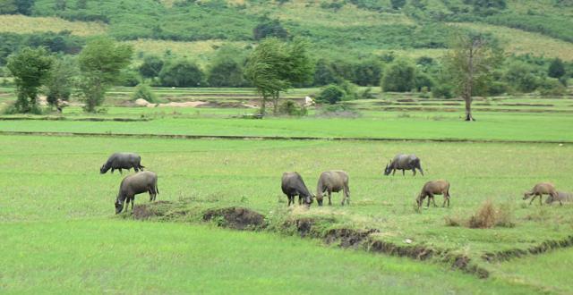 Wasserbüffel grasen im Reisfeld. Was fressen sie, den Reis?
