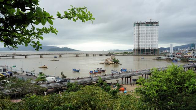 Blick vom Tempel auf Nha Trang und die Mündung des Flusses Song Cai.