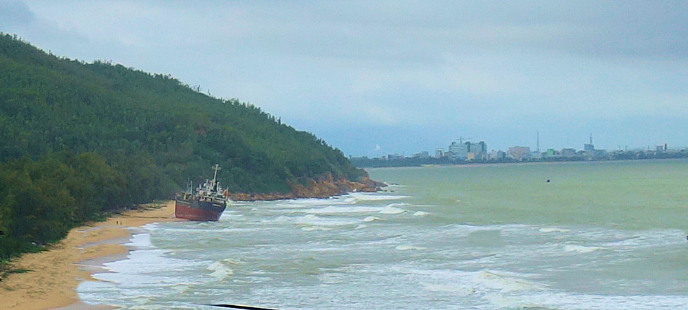 Das Frachtschiff hat es im Taifun nicht mehr nach Quy Nhon (rechts im Hintergrund) geschafft.