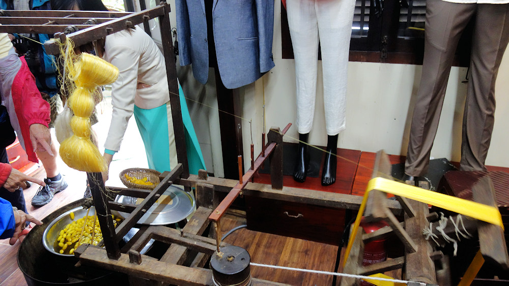 Die Kokons werden mit den im heißen Wasser getötetet Puppen abgewickelt und auf eine Haspel gezogen.