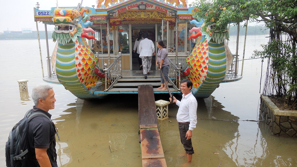 Auf einem improvisierten Steg konnten wir das Boot besteigen. Linh (links), unser vietnamesischer Guide überwacht das Ganze.