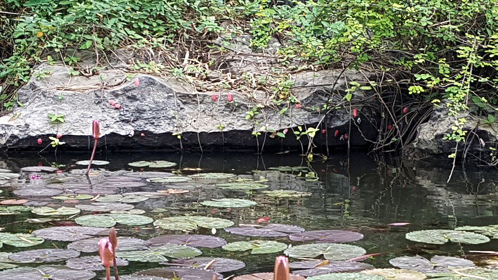 Die rosa Dinger am Fels sind verpuppte Schnecken, die hier vorkommen.