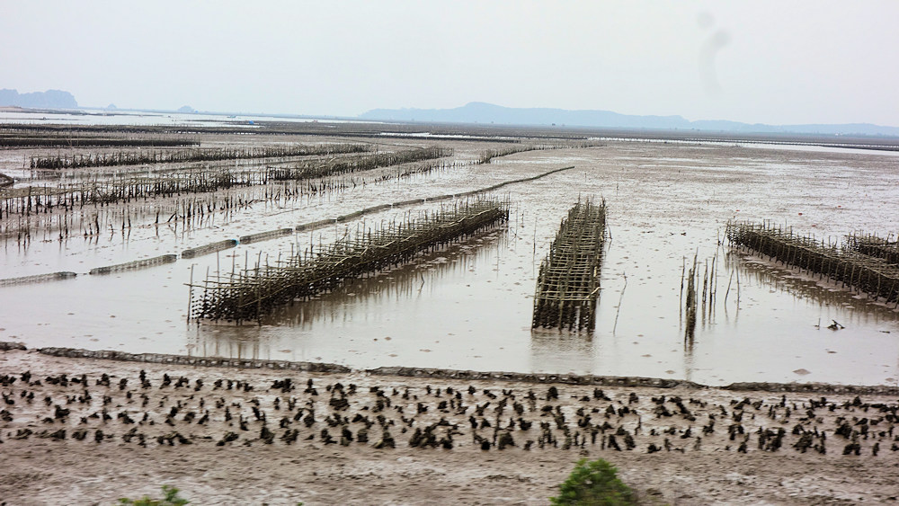 Muschelzucht am Zufahrtsdamm zur Insel Tuan Chau.