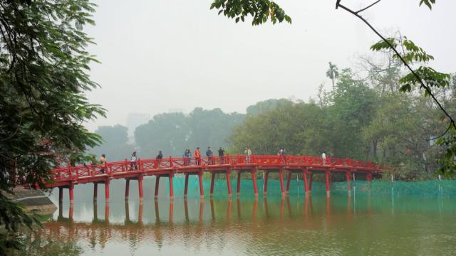 Die Huc-Brücke im "See des zurückgegebenen Schwertes". Ein Thema, das gestern im Wasserpuppentheater auch gezeigt wurde. Also mit dem Zauberschwert besiegt der arme Fischer Le Loi im 15. Jahrhundert die Chinesen, die damals Besatzer waren. Nach dem Sieg dankte Le Loi am See den Göttern, da stieg das Schwert plötzlich zum Himmel und wurde ein Drachen. |