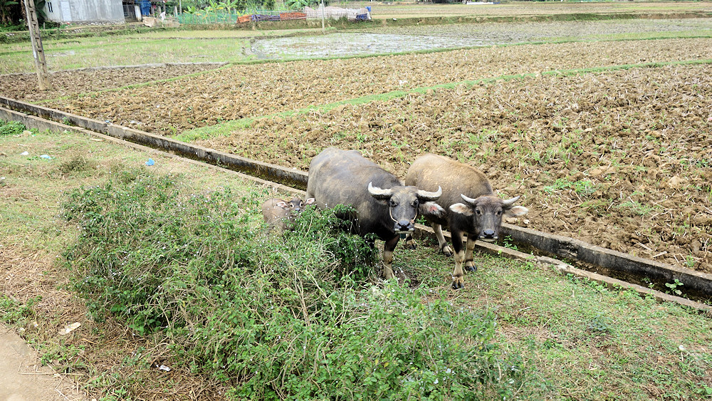 Das Wasserbüffelkalb hat sich hinter dem Busch versteckt.