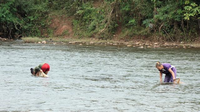 Die linke Frau hat eine Taucherbrille um besser unter Wasser zu sehen.