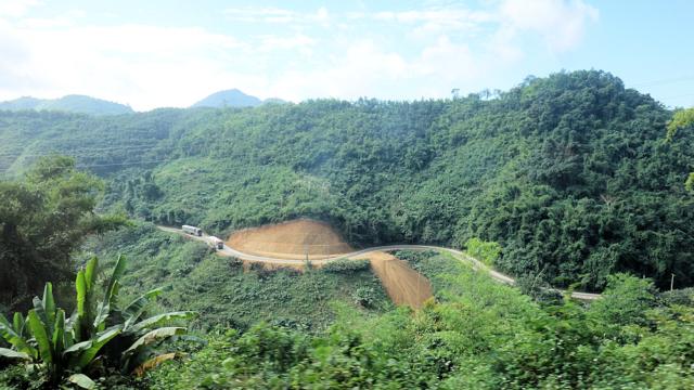 Dieser Abschnitt ist die Hauptstraße zwischen China und Vientiane, der Hauptstadt Laos. Deshalb sind viele Laster unterwegs.