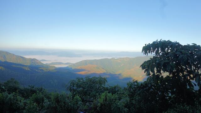 Um 7:00 Uhr auf der Paßhöhe in fast 2.000 m: Die Täler liegen noch unter dem Nebel.